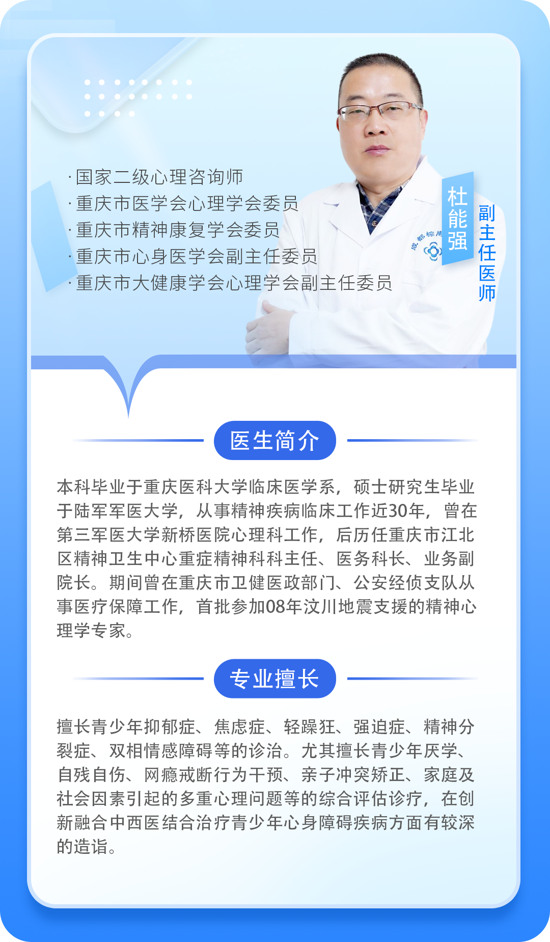 我院厌学门诊由原重庆市江北区精神卫生中心副院长 杜能强领衔,联合我院专家团和我院经验丰富的心理咨询团队,通过科学的评估与分析,准确找出孩子学习困难的根源,运用系统家庭治疗、认知行为治疗、正念疗法、沙盘游戏疗法、艺术治疗、团体治疗等理论技术,解决学生“厌学”背后情绪问题、网络沉迷、睡眠节律紊乱、人际交往困难、亲子沟通不畅以及可能的心身疾病问题,共同提升孩子的心理健康水平、学习能力与幸福感,帮助孩子恢复功能,早日回归学校。