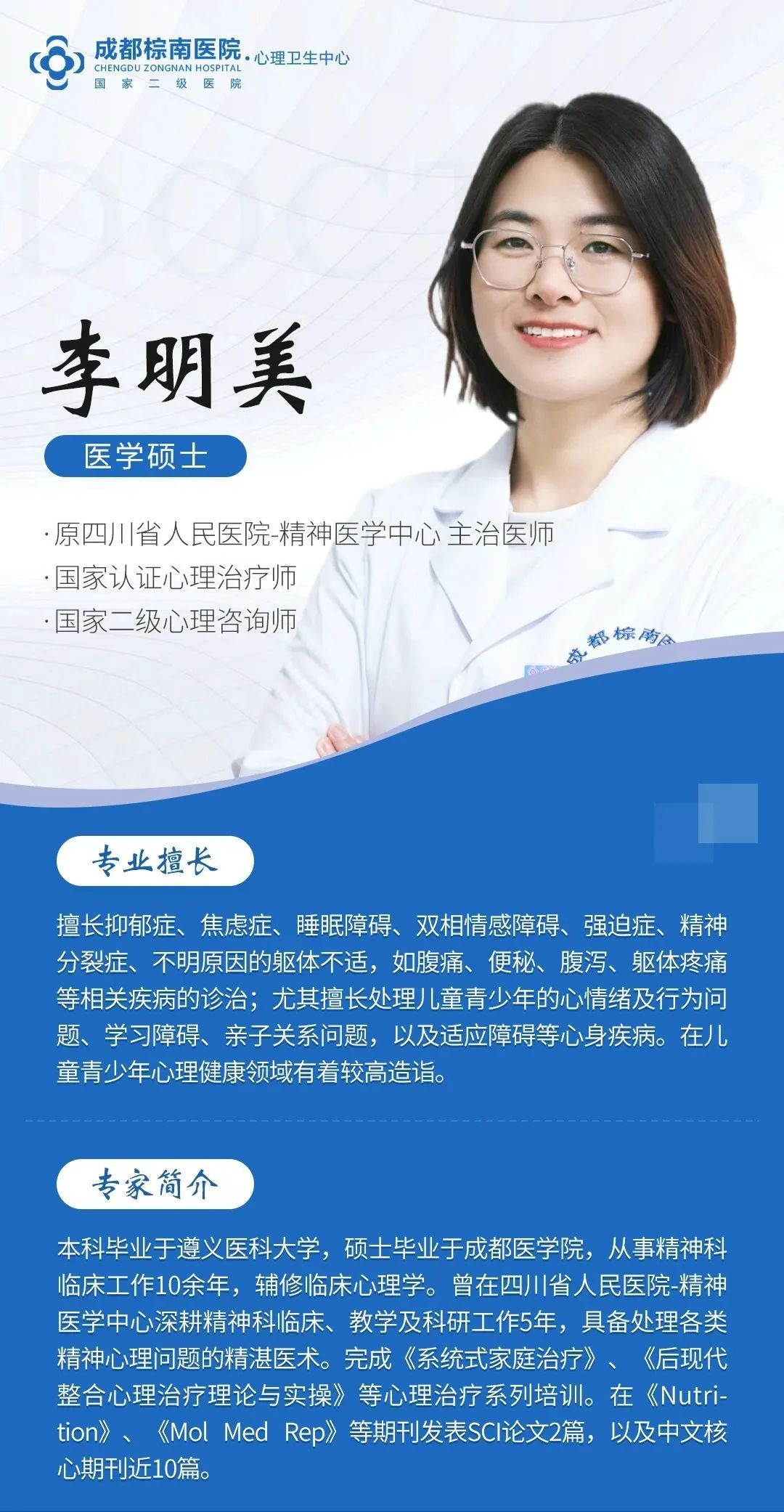 为进一步强化团队精神心理诊疗实力,邀请前四川省人民医院精神医学中心专家李明美加入魏姐姐精神心理团队,强强联合,医术共融,让患者在家门口享受到优质、科学、便捷的医疗服务。