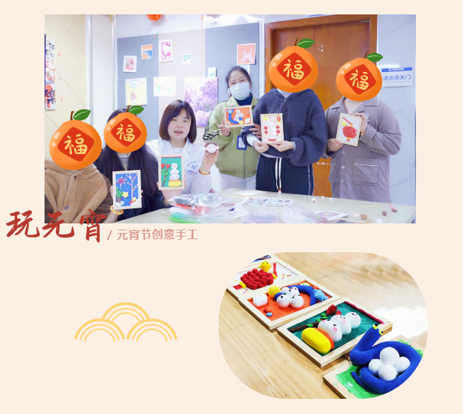 住院患者在工娱老师的引导下,充分发挥自己的想象力和创造力,用黏土捏出一个个五颜六色、充满元宵元素的手工作品,最后以画框装饰,节日仪式感满满,整个病区充满了欢声笑语,在动手过程中也收获了成就感。患者开心的说:“谢谢医护人员这么贴心有爱,让我们感受到家一样的温暖!”