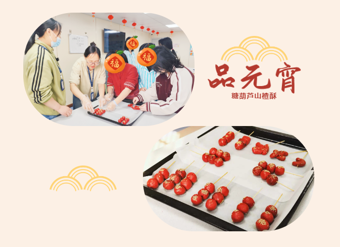 烘焙老师指导患者把黄油酥皮山楂化作福和禄,一个个串联起来,把浓浓的年味,紧紧锁进了每一块酥脆里。寓意甜蜜、团圆和幸福的糖葫芦等待着大家的品尝~